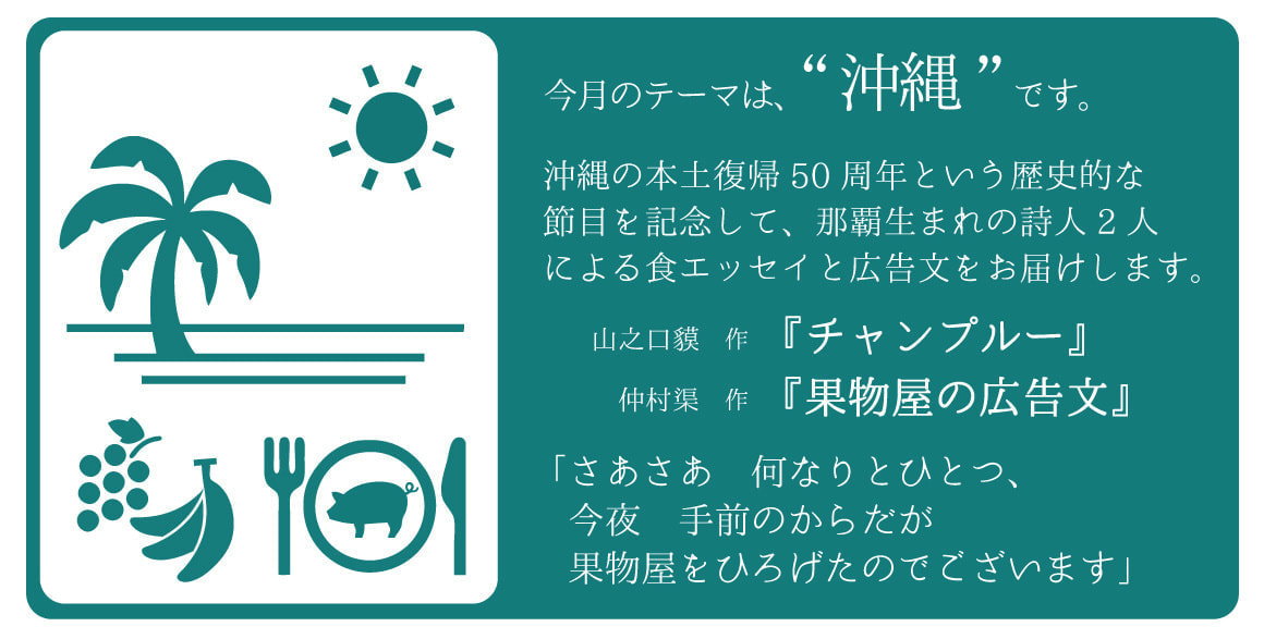那覇生まれの詩人2人による食エッセイと広告文をお届けします。