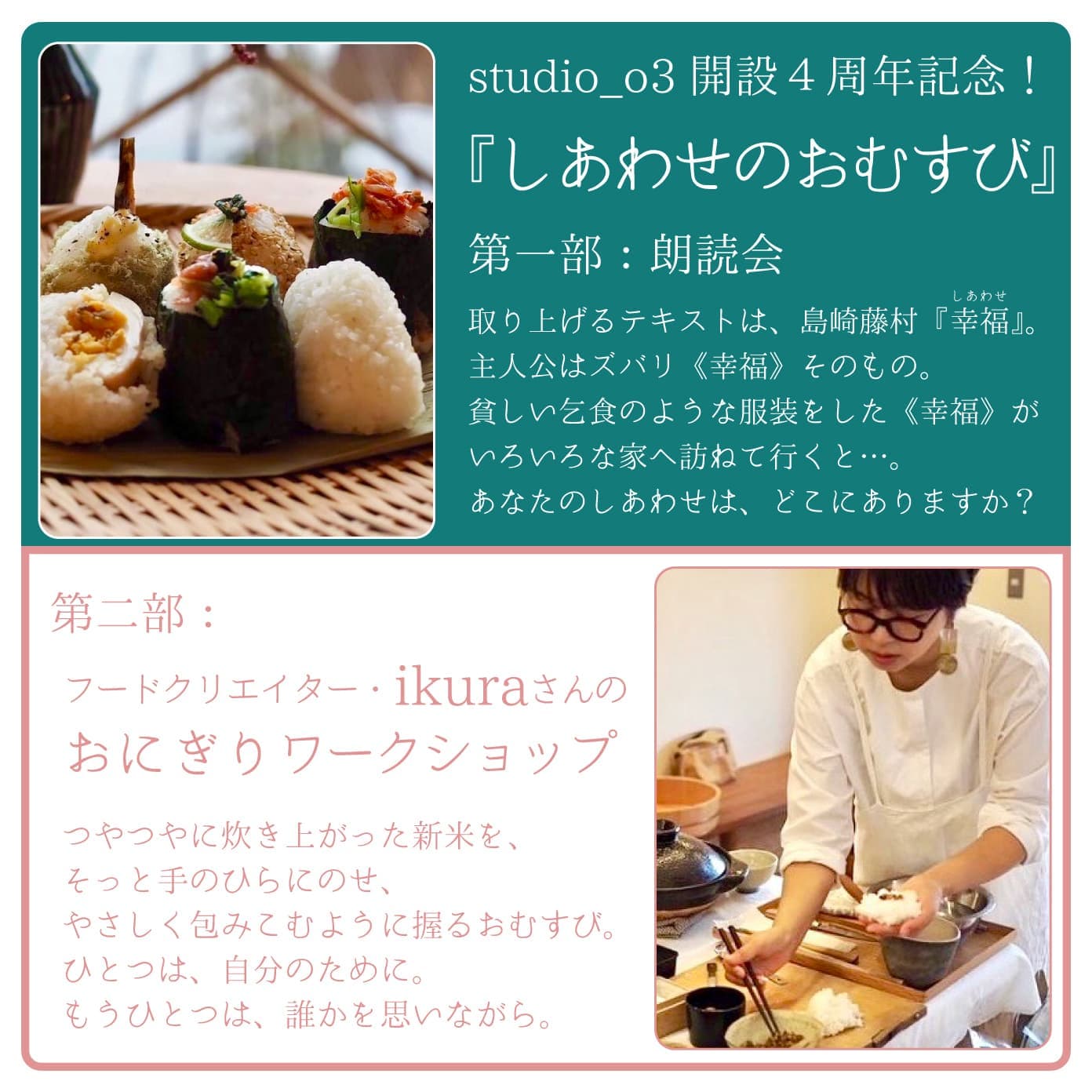 /studio_o3 開設4周年記念 朗読会&おむすびワークショップ《あとは読んでのお楽しみspecial》 |