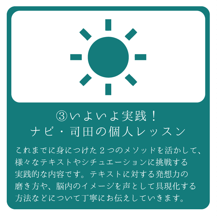 テキストに対する発想力の磨き方や、脳内のイメージを声として具現化するやり方などについて丁寧にお伝えしていきます。